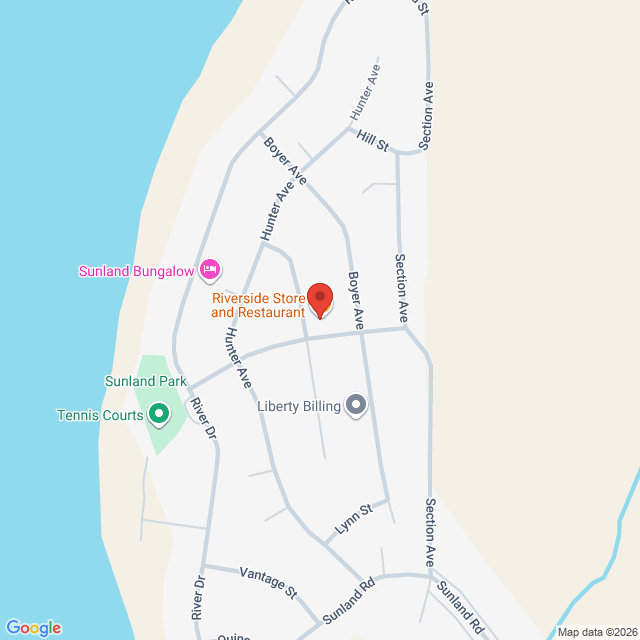 Go up the stairs to the right of the Riverside Restaurant Entrance